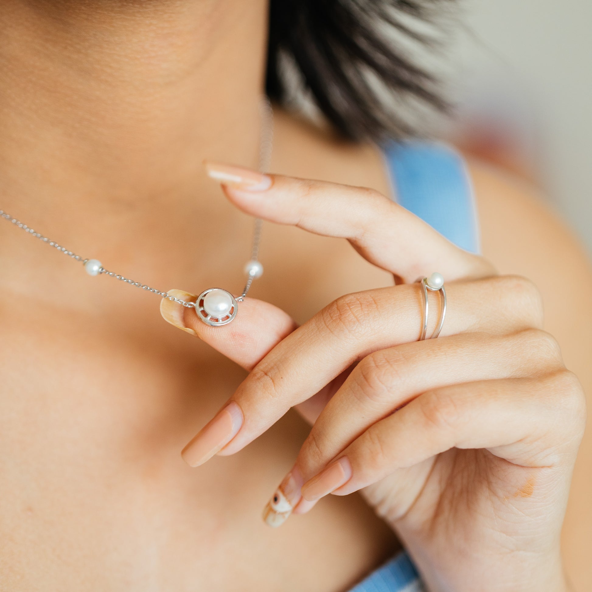 Circles have a way of holding meaning infinite, complete, and quietly reassuring. The Encira Necklace Set reflects that thought, with a luminous cultured freshwater pearl encircled in polished 92.5 sterling silver at its heart. Two more pearls rest gracefully along the chain, adding balance and rhythm to the design.