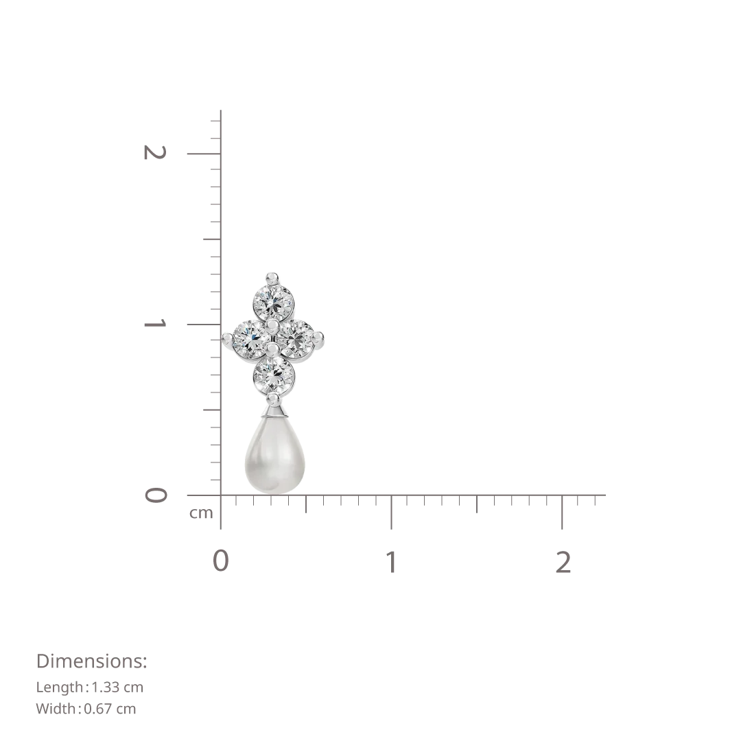 Crafted in sterling silver, these earrings pair the shine of CZ stones .Four cubic zirconia stones form a refined cluster at the top, adding a touch of subtle sparkle. Suspended below is a smooth, drop-shaped pearl that moves with quiet elegance. Classic and timeless, this elegant design is perfect for special occasions—subtle in its charm, yet effortlessly striking.