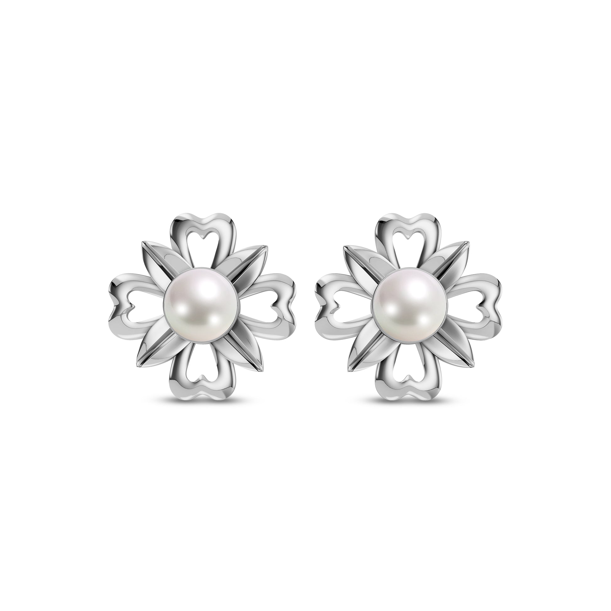 A classic floral design with silver petals and a large pearl at the center. Elegant and easy to wear. These floral studs blend natural elegance with timeless charm, perfect for quiet statements.