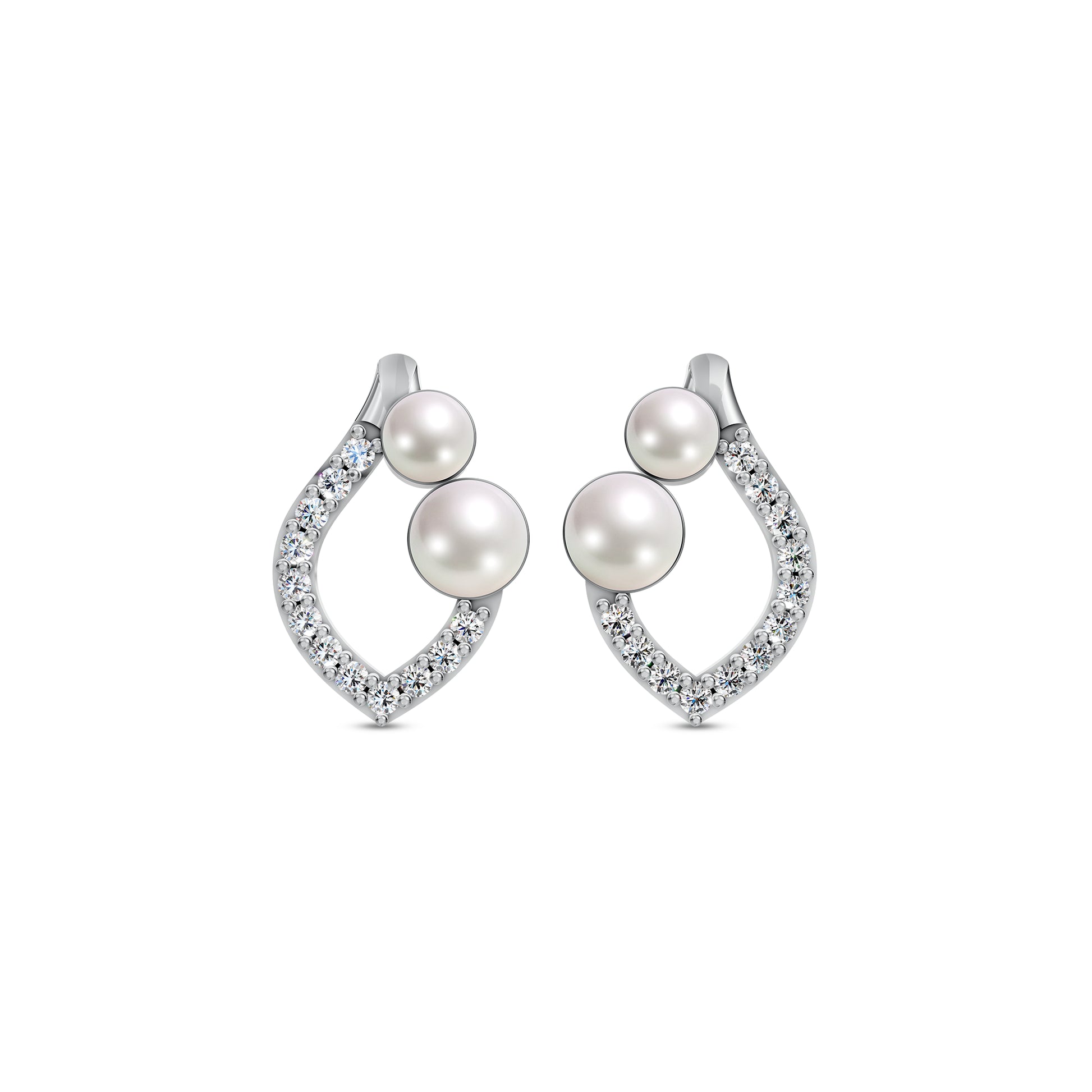 A sleek silver design shaped like a delicate leaf or petal, paved with shimmering CZ stones. Two uneven pearls sit at the edges, adding an unexpected and unique touch. Minimal yet distinctive, these earrings blend softness with modern elegance.