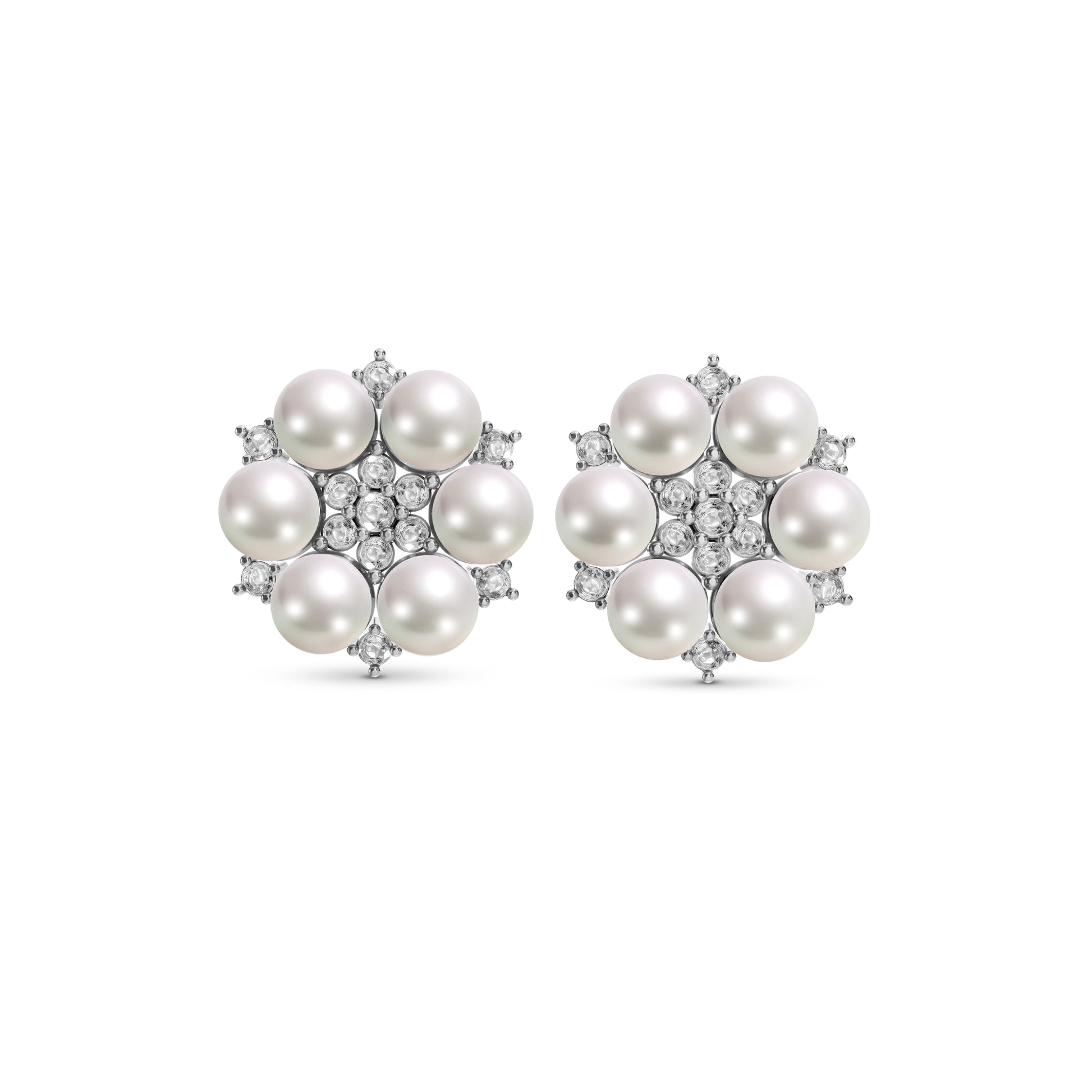 Symmetry has its own quiet charm especially when it comes wrapped in cultured freshwater pearls. These earrings bring together six pearls around a radiant cluster of CZ stones, forming a soft, floral silhouette that’s both balanced and expressive.